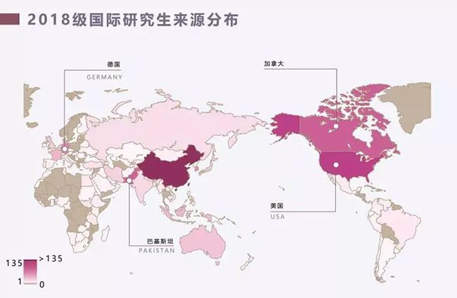 2018年共錄取來自98個國家的國際研究生999人,其中來自美國、加拿大、巴基斯坦、德國、韓國的人數最多。錄取的國際研究生中,來自一帶一路沿線國家的學生共379人,占國際研究生錄取總數的38%。