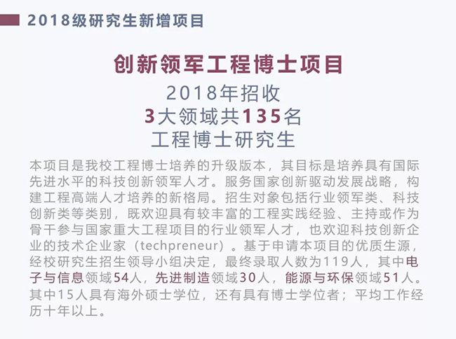 2018級研究生新增創新領軍工程博士項目,面向行業領軍類、科技創新類等類別人才進行招生,最終錄取來自電子與信息、先進制造和能源環保三大領域的工程博士研究生共135人。