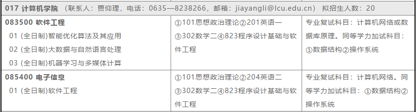 我院研究生招生計劃全為全日制學術學位和全日制專業學位,軟件工程學碩初試科目英語、政治、數學(數學二)為國家統考,專業課綜合為我校自主命題。初試和復試參考書目請與學院聯系(0635-8238789).