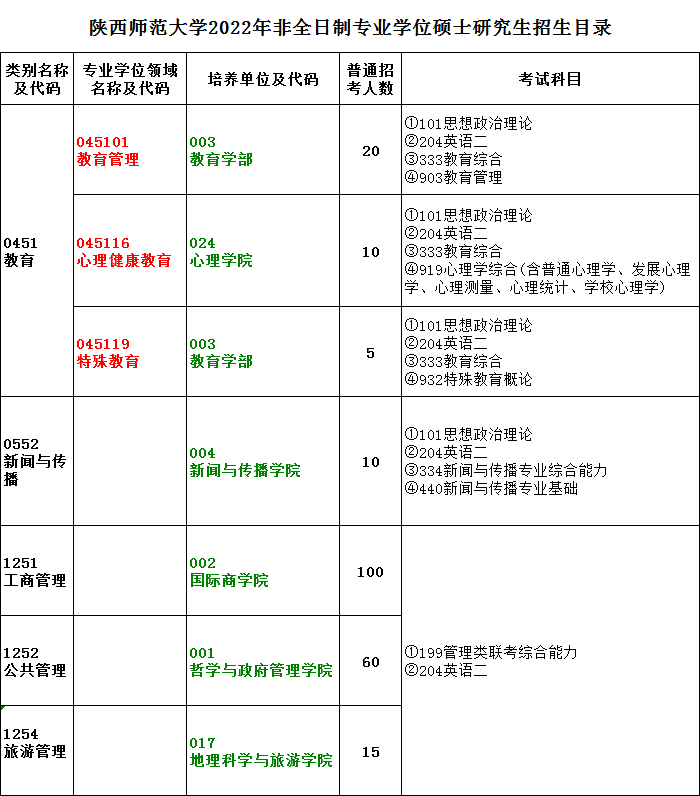 陜西師范大學2022年非全日制專業學位碩士研究生招生目錄已出,2022年陜西師范大學非全專業具體有哪些專業招生呢?招收多少人呢?一起來看看吧!