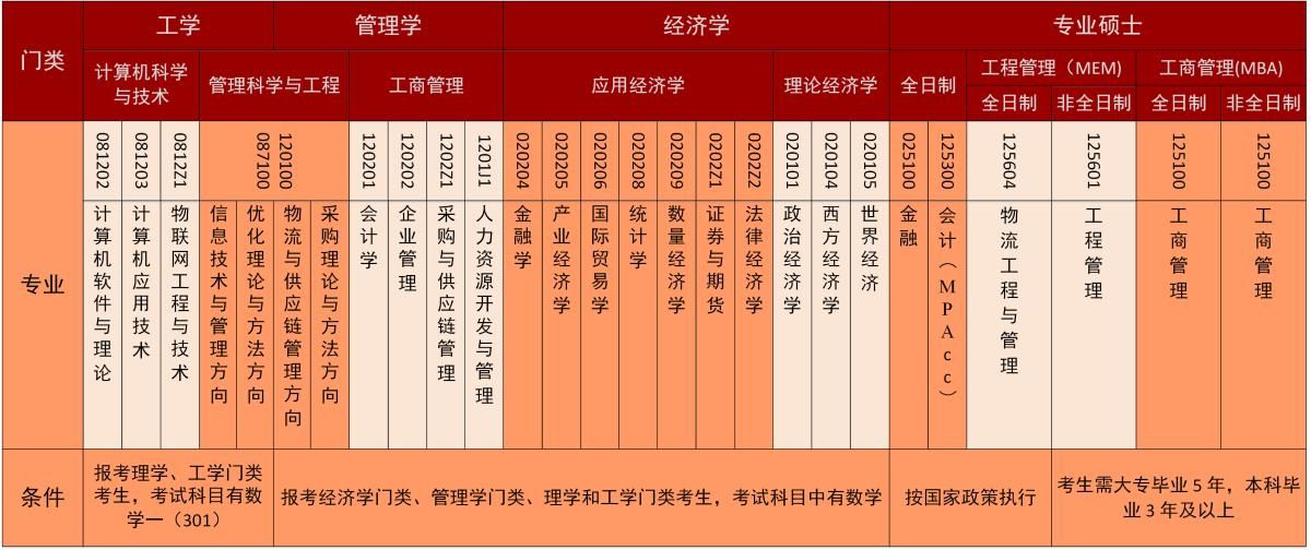 ??目前我校擁有應用經濟學、理論經濟學、管理科學與工程、工商管理、 計算機科學與技術 共5個一級學科碩士學位授權,下設22個二級學科(研究方向)碩士學位授予權。 我校還擁有金融專碩、會計專碩(MPAcc)、工商管理碩士(MBA)、工程管理碩士(MEM) 4個專業學位碩士培養類別。其中工商管理碩士(MBA)包括全日制與非全日制,工程管理碩士(MEM)包括物流工程與管理領域(全日制)和工程管理領域(非全日制)。具體招生方向和領域如下圖所示: