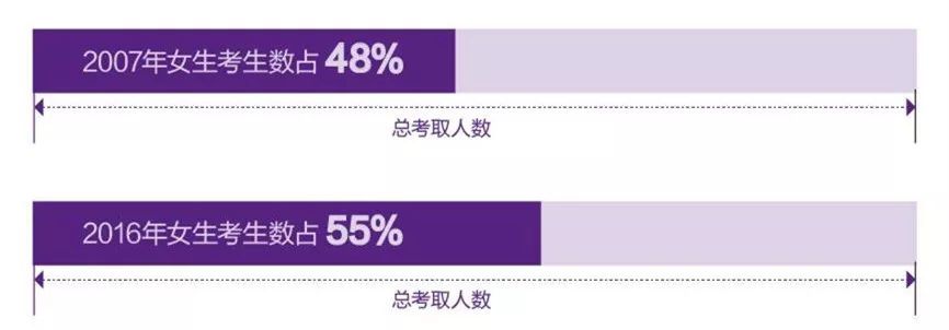 從性別比例來看,女生已經成為考研主流,在2007年僅占到48%,到2016年已經增長至55%,提升近7個百分點。