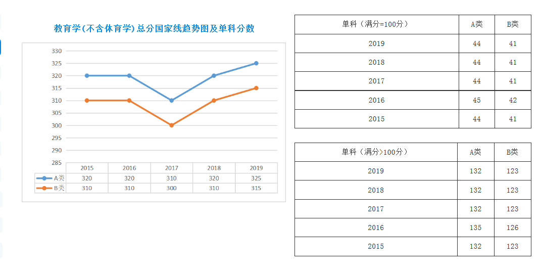 今年2019年A區國家線是325,B區國家線是315。近幾年教育學國家線趨勢如下: