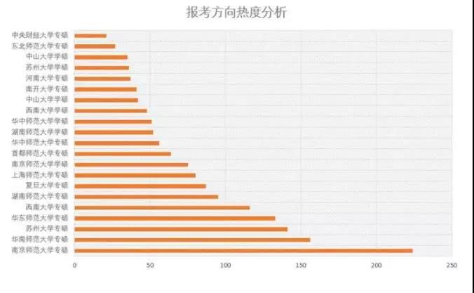 報考熱度:一般來說,綜合實力強,或者心理學專業實力突出的院校,都是報考的熱門選擇,競爭強度較大。下圖的是2019年部分院校的報考人數,圖中紅條越長的報考人數越多,意味著競爭更加激烈,像南京師范大學,2019年考研的報名人數已經突破了四位數,如果報考這類熱度較高的學校,考生要有心理準備。