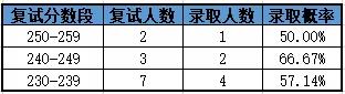 一志愿全日制復試分數線235分,參加復試12人,錄取7人,復試錄取比為1.71;復試最高分254,最低分236;全日制錄取初試最高分254分,最低分236分;