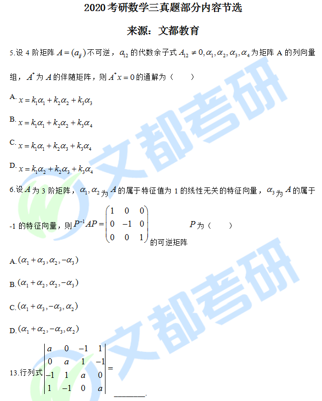 伴隨著2020考研數學考試的結束,2020考研數學三真題也陸續整理出來,本期文都考研為大家帶來的是2020考研數學三真題部分內容節選原題,關注2020考研數學三真題的考生不要錯過本文內容哦!如果你還不清楚,不妨看看2020考研數學三真題部分內容節選的文章,如有需要及時加入陜西文都20考研交流群, 陜西文都考研網持續為您提供考研所需的相關指導信息。20考研資料共享:【互動可加群】丨官方網站【@陜西文都考研】