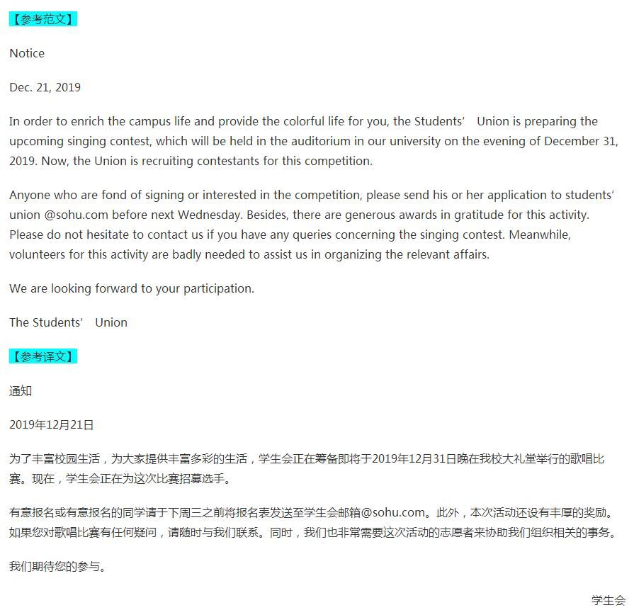 剛剛下了考場的你,想不想趁著記憶還算鮮明,趕緊來估估分鴨?文都考研老師給大家準備了2020考研英語一真題寫作參考范文:通知留學生歌唱比賽(小作文),快來看看有沒有你需要的資料!