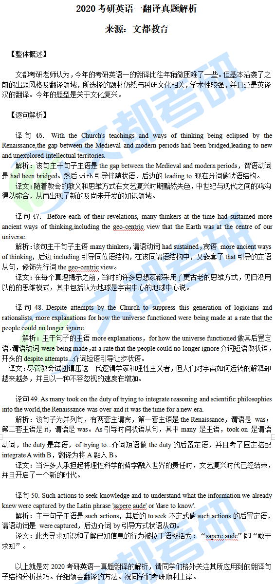 剛剛下了考場的你,想不想趁著記憶還算鮮明,趕緊來估估分鴨?文都考研老師給大家準備了2020考研英語(一)翻譯真題答案解析,如果你還不清楚,不妨看看2020考研英語(一)翻譯真題答案解析的文章,如有需要及時加入陜西文都20考研交流群, 陜西文都考研網(wǎng)持續(xù)為您提供考研所需的相關指導信息。20考研資料共享:【互動可加群】丨官方網(wǎng)站【@陜西文都考研】