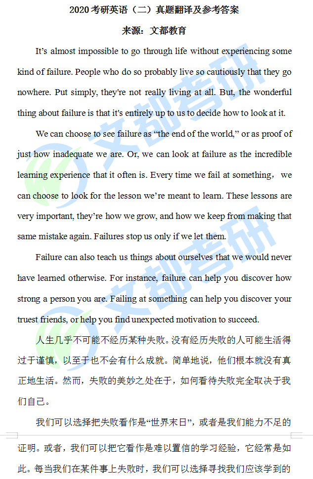 2020考研英語剛剛結(jié)束,考過的同學(xué)不知感受如何,文都考研老師給大家?guī)砹?020考研英語二真題翻譯及參考答案,如果你還不清楚,不妨看看2020考研英語二翻譯真題及參考答案的文章,如有需要及時(shí)加入陜西文都20考研交流群, 陜西文都考研網(wǎng)持續(xù)為您提供考研所需的相關(guān)指導(dǎo)信息。20考研資料共享:【互動(dòng)可加群】丨官方網(wǎng)站【@陜西文都考研】