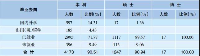 在1247名碩士研究生中,國內升學17人,占碩士畢業生人數的1.36%;通過各種方式就業1117人,占碩士畢業生人數的89.57%,就業率為90.94%。