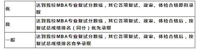 合格:預(yù)面試分?jǐn)?shù)60分以上。MBA擬錄取資格對照表如下: