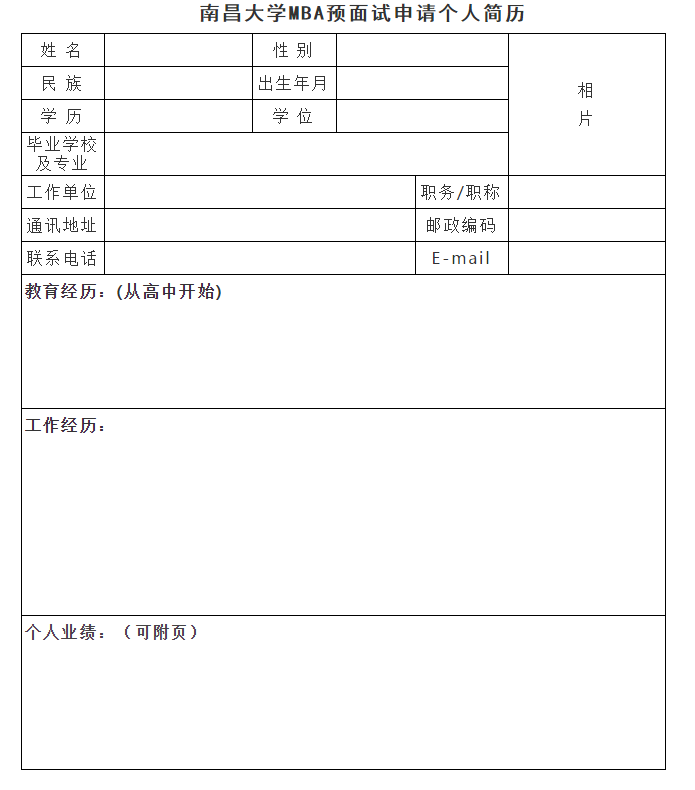 申請者填寫南昌大學(xué)MBA預(yù)面試申請個人簡歷南昌大學(xué)MBA預(yù)面試個人簡歷樣板(表格見南昌大學(xué)MBA教育中心網(wǎng)站上主頁“資料下載”中),并按下表時間提交到MBA教育中心或發(fā)送郵件至:E-mail:mba@ncu.edu.cn。咨詢熱線:0791-88304514