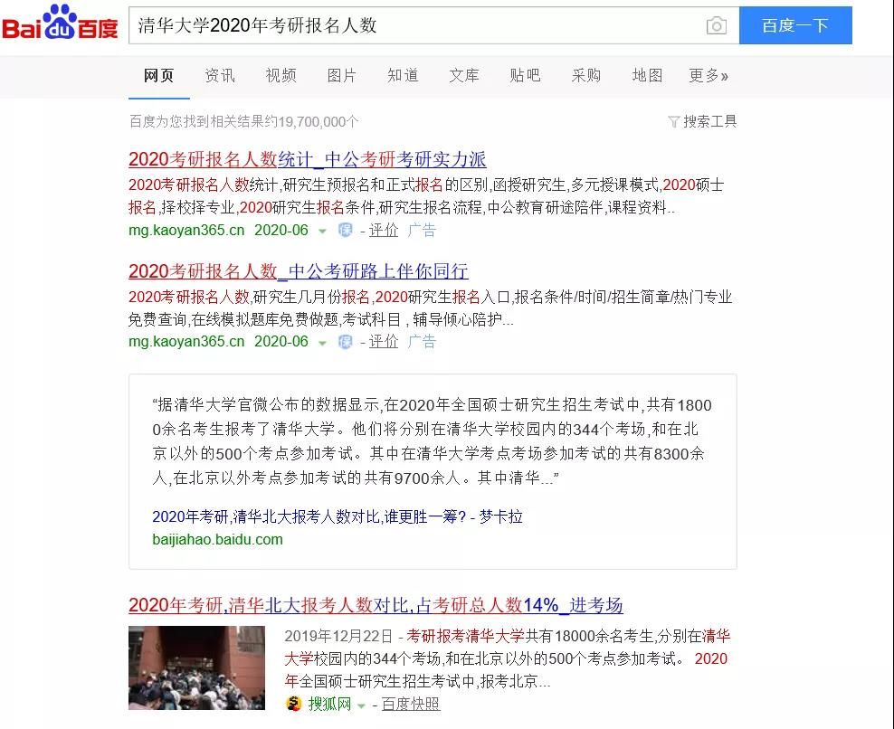 報(bào)考人數(shù)是一個(gè)比較關(guān)鍵的信息,從中可以看出你的競(jìng)爭(zhēng)對(duì)手到底有多少。數(shù)據(jù)可以從官網(wǎng)查找或者直接在瀏覽器搜索:XX大學(xué)2020年考研報(bào)名人數(shù),有的高校特別是名校熱門(mén)專(zhuān)業(yè)報(bào)考人數(shù)非常多,如果沒(méi)有足夠強(qiáng)大的實(shí)力建議不要報(bào)考,否則容易成為炮灰!