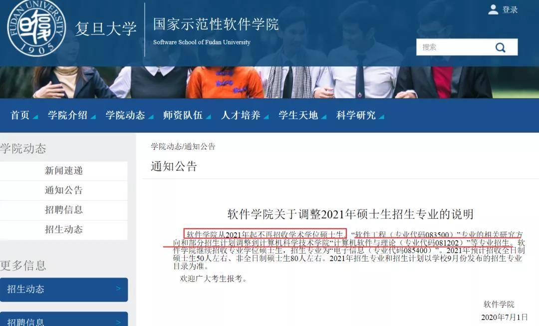 當然公告中也明確表明,“軟件工程(專業代碼083500)”專業的相關研究方向和部分招生計劃調整到計算機科學技術學院“計算機軟件與理論(專業代碼081202)”等專業招生。