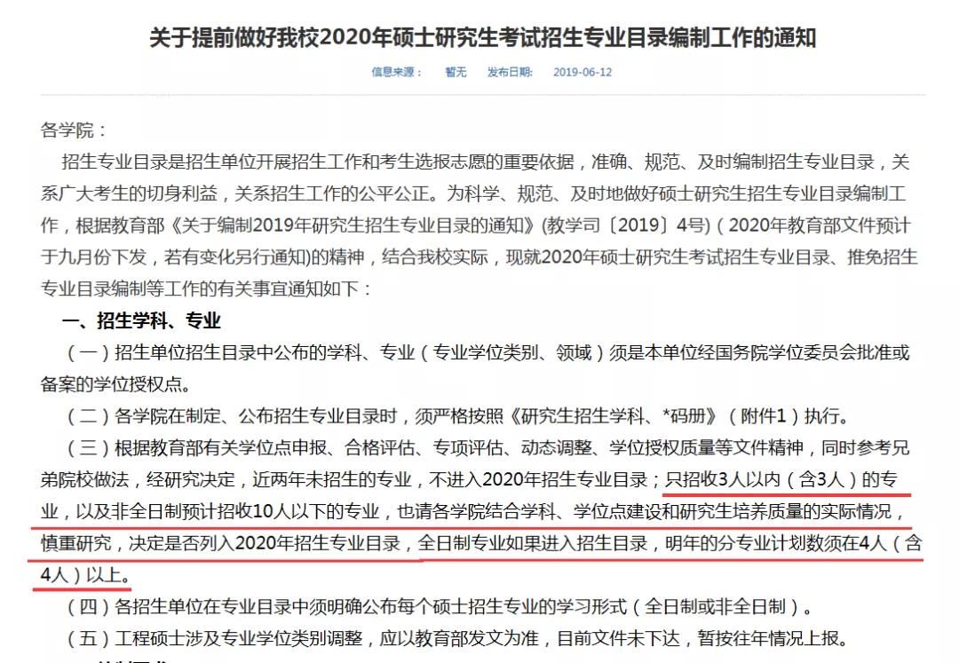 下面是福州大學20屆的相關招生公告,公告中明確表示僅招收3人以內的全日制專業各學院要慎重考慮是否加入專業目錄,但如果加入專業目錄,第二年的計劃招生數必須在4人及以上。