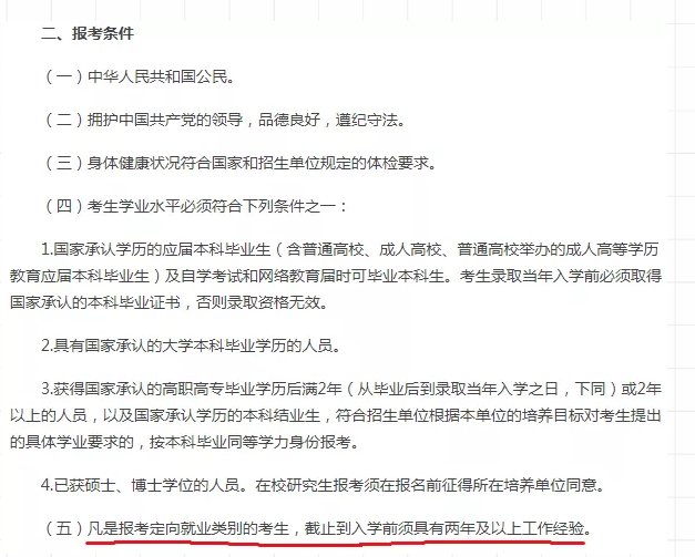 凡是報考定向就業類別的考生,截止到入學前須具有兩年及以上工作經驗。